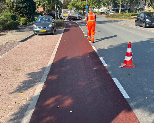 Nexus en de gemeente Hellendoorn waren onze opdrachtgevers voor het aanbrengen van rode EAB-fietssuggestiestroken aan beide zijden van de Smidsweg in Nijverdal. De markering was vooraf aangebracht, waarna met de EAB-machine door Rapid een fietssuggestiestrook met een breedte van circa 1,00 tot 1,80 meter is aangebracht.